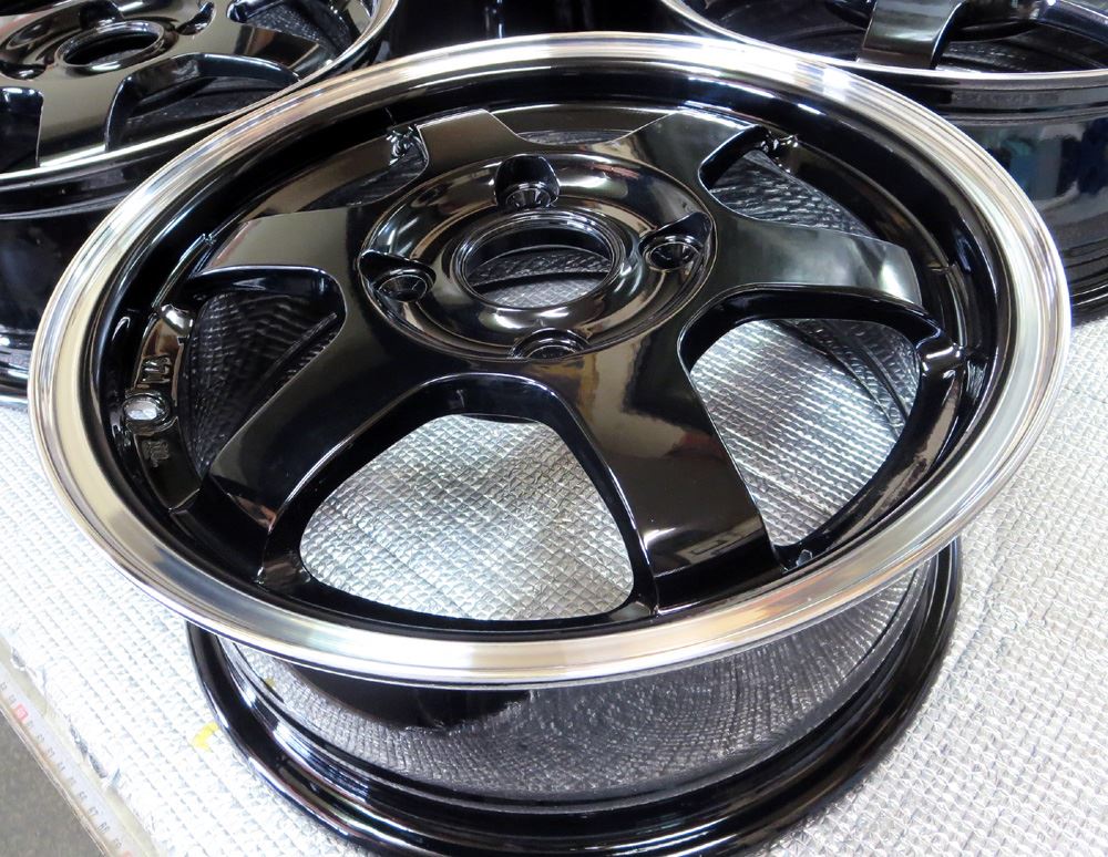 かわいい14インチTE37のアルマイトブロンズからパウダーグロスブラック+リムポリッシュです。
