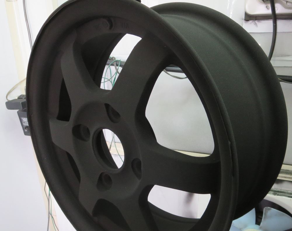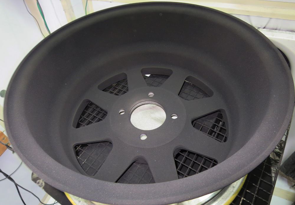 スポークサイド面からインナーリムまで先にパウダーグロスブラックを静電噴射します。