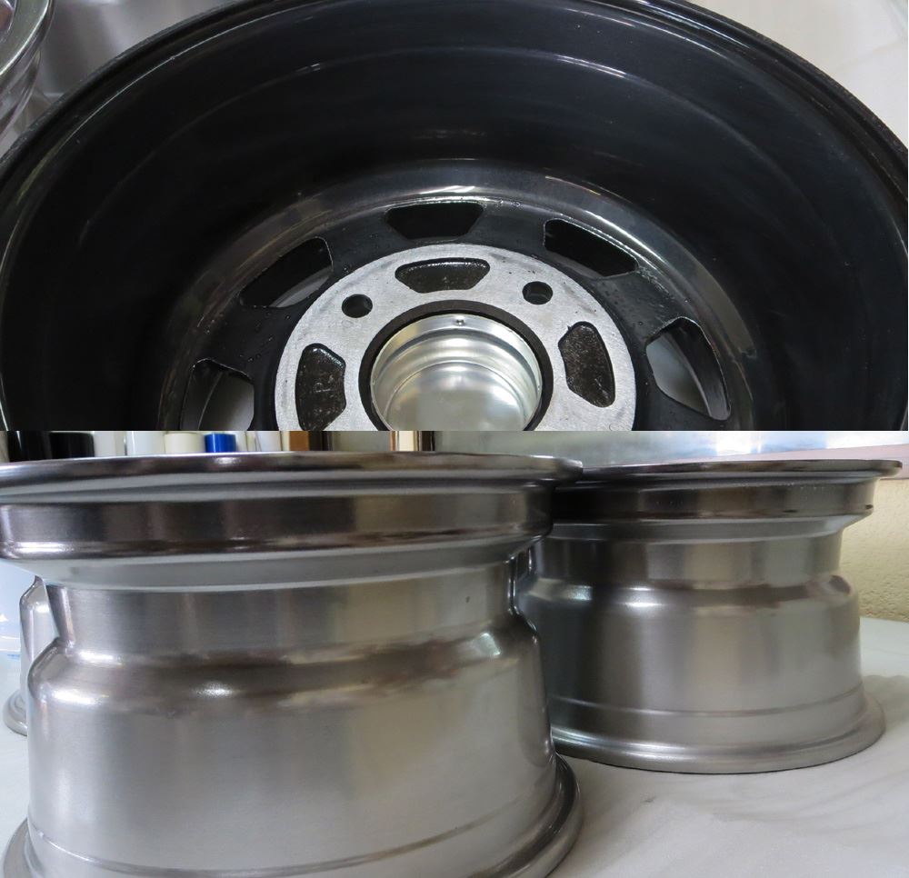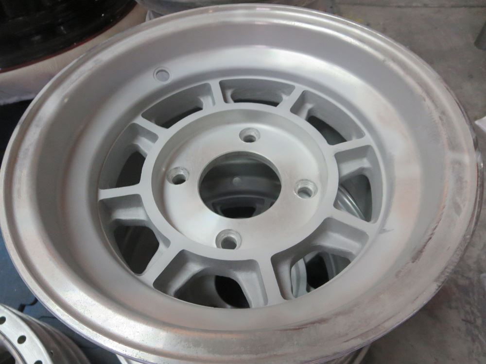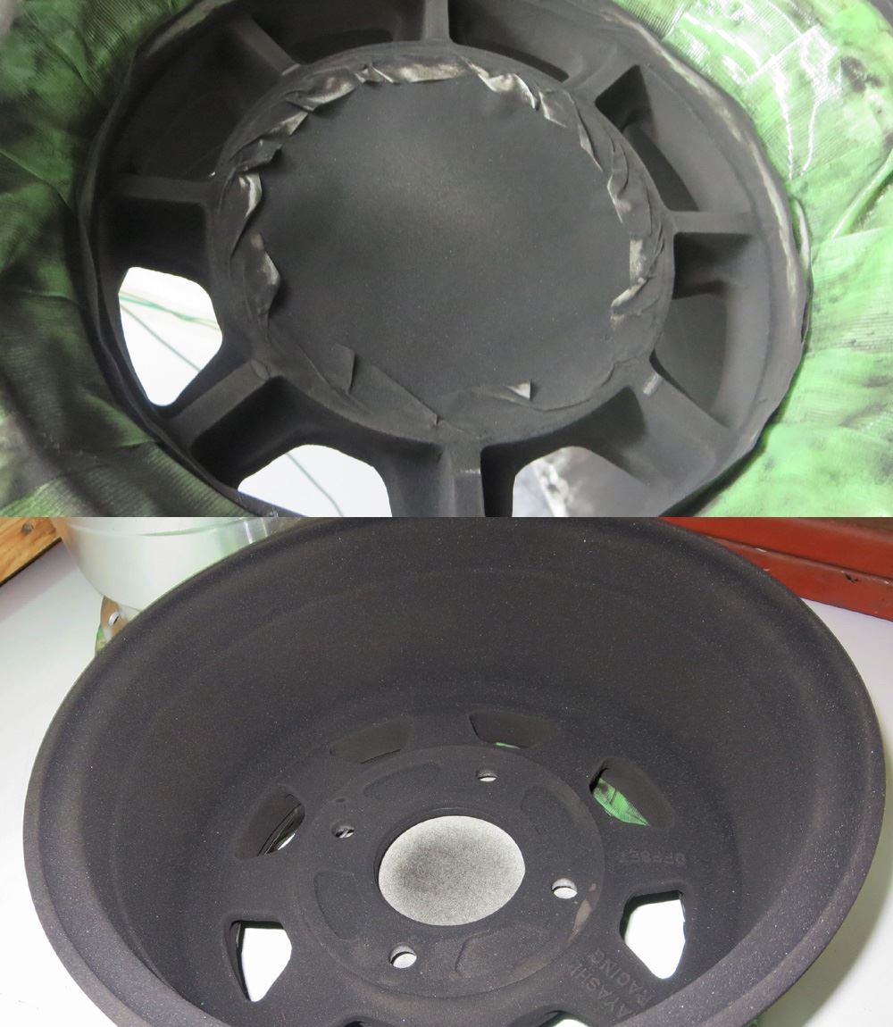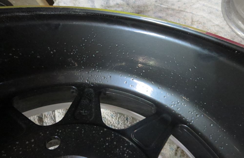 インリムまで腐食が酷かったためパウダーコートの高温焼き付け(200℃)で腐食箇所から湧きが発生しました。※腐食の酷い中古のインリムへのパウダーコートは高温焼きにより腐食部からブツ、湧きが出てしまいます。でも・・そこは裏面インリムですので溶剤塗装でビジュアル重視するより耐久性の観点から多少のブツは犠牲、有り、としてもインリムにはパウダーコートの方が良いかと思います。ガラスコーティングなども必要ないです。。