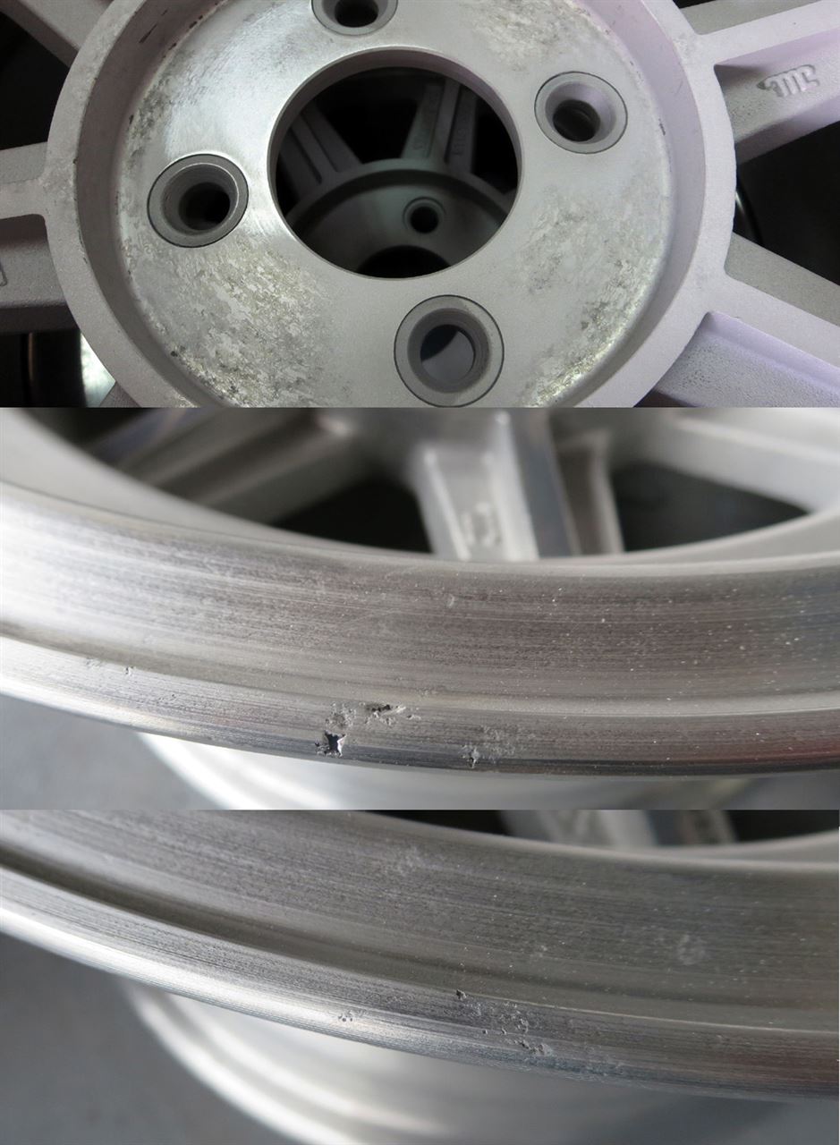 ホイール穴付近やリムの一部など素材を大きく痛めて穴が開いてます。
