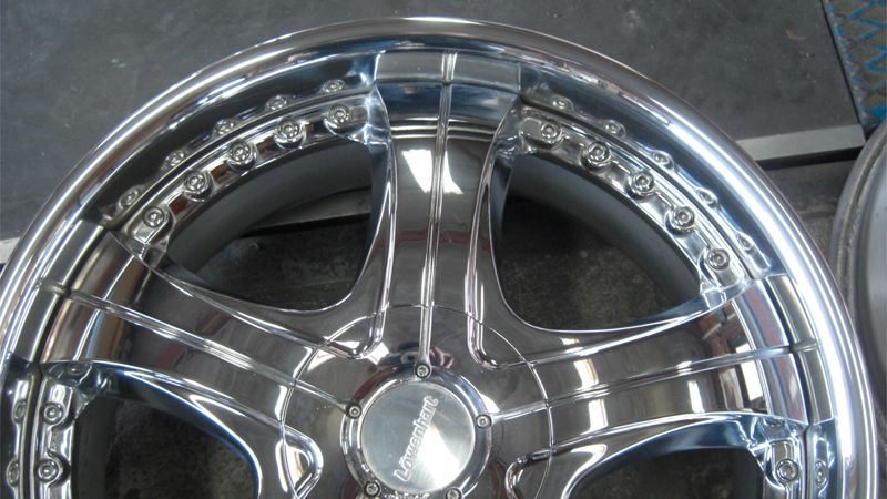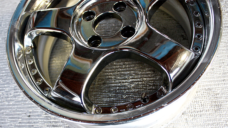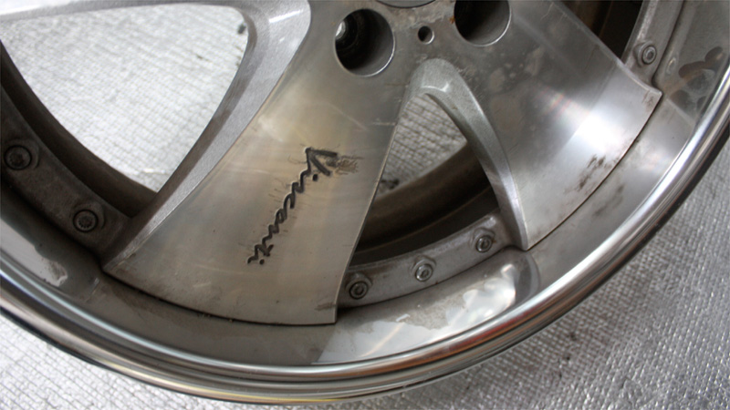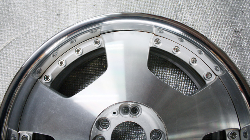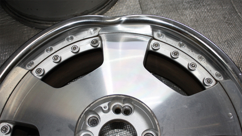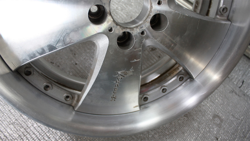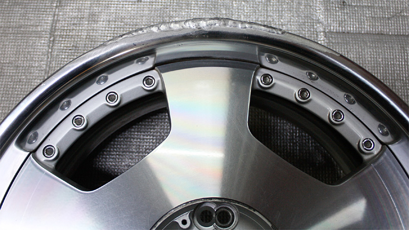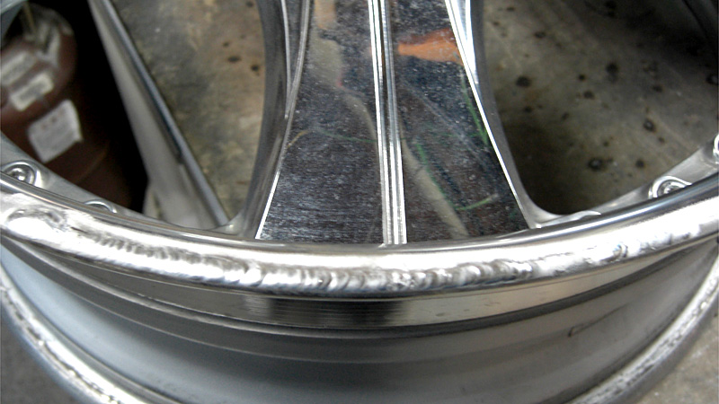 クロームメッキやスパッタリングメッキのように他の材質を蒸着したメッキ処理とは違い、アルミ素材自体の表面被膜のメッキ工法のため修正に伴う、肉盛り溶接などの箇所はアルマイト処理後反応を起こし黒シミのような現象が現れます。そのためアルマイトリムは肉盛り修正したものに関してアルマイト再メッキは不可となります。通常のアルマイトリム修正は磨きによる鏡面研磨仕上げとなります。