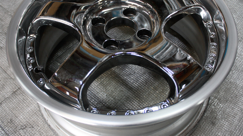 クロームメッキやスパッタ・蒸着メッキなどのメッキ工法はアルミ素材の表面上へ他の金属(銅箔、クローム、銀箔)などを化学反応で貼り付け(蒸着)する工法に対してアルマイトメッキは陽極の反応を利用してアルミ合金素材自体の表面を反応させて酸化被膜を付けるメッキに類似した工法で収縮性に富むリムに対応した2・3Psホイールの組み立て式の合金プレス型のリムに多く使われています。