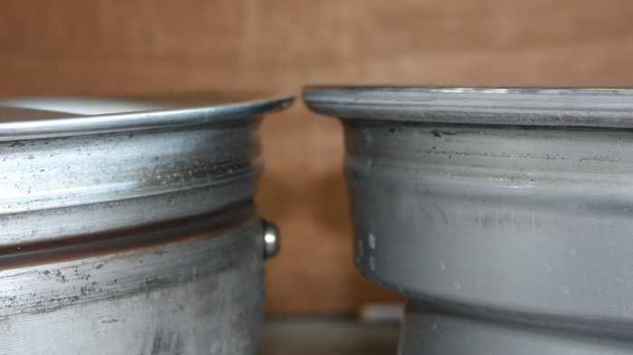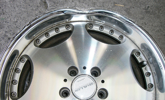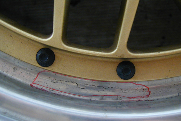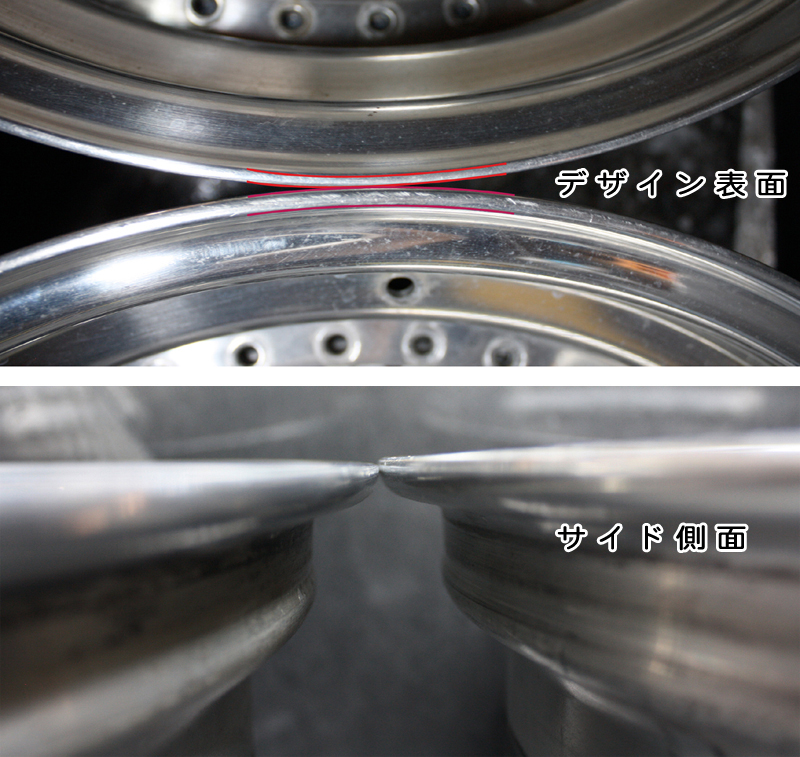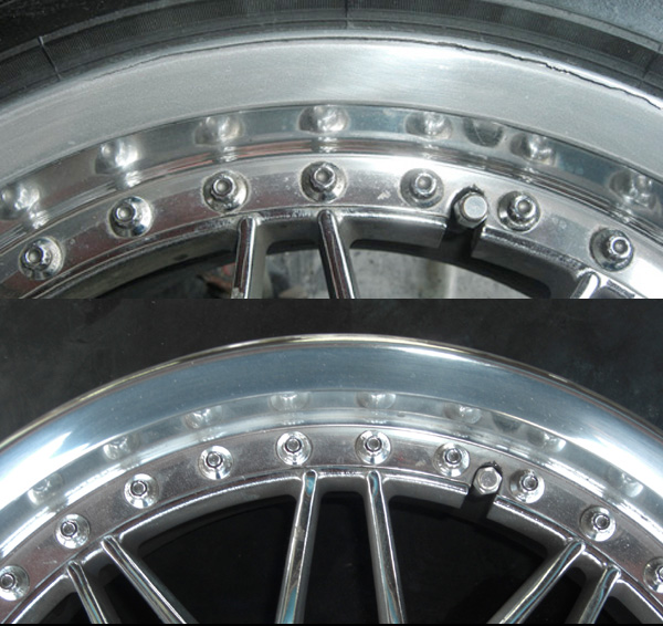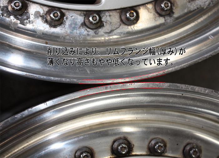 肉厚が極端に薄くなり、強度が失われるばかりで無く、削り込んだ分、リムの高さも低くなり、リム全体の外周面も当然小さくなります。リムの形状が変わるため、タイヤリムとの接地面が失われ、エアー漏れの原因にもなります。さらにカラー塗装で隠れてしまう塗装ホイールの場合、削り込んでパテ埋して、色を塗ってしまえば解らなくなりますので素人だましの厄介は修正です。納期やお値段だけで判断されると大変危険です。