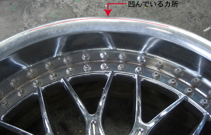 3ミリほど凹んでいる箇所を他の箇所となじむまで3ミリ以上削り込む訳ですから、3ミリ以上の肉厚が全体的に無くなり薄く仕上がってしまう事になりそれを隠すためリム裏はコーキングで隠してある修正品をよく見かけます。