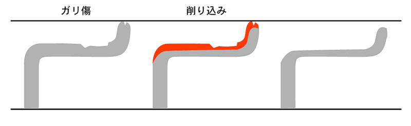 削り込み修正とは、曲り修正などで生じた凸凹、波うち状のものを平滑にするためや、ガリ傷への凹み箇所へアルミ肉盛り溶接をせずに、高さや面を合わすために低い箇所を基準に、リム全体をひたすら削り込んで見た目だけを治し結果、形状が変わり薄っぺらく仕上げてしまう、強度安全性を無視した、心無い悪質なリム研磨修正の事です。