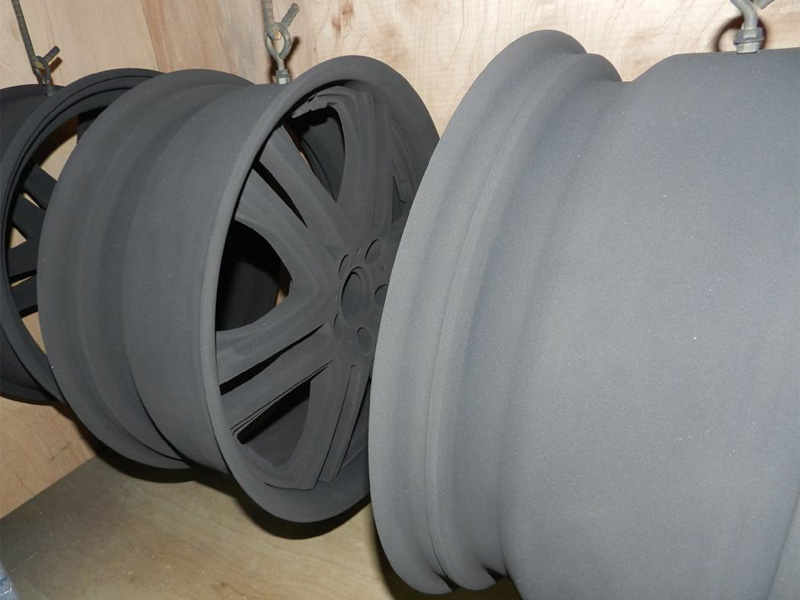 ①溶剤シルバー&ポリッシュ | ②剥離ブラスト研磨 | ③パウダーマットブラック丸塗り | ④パウダーマットブラック丸塗り | ⑤リムグロスブラック 完成 | |