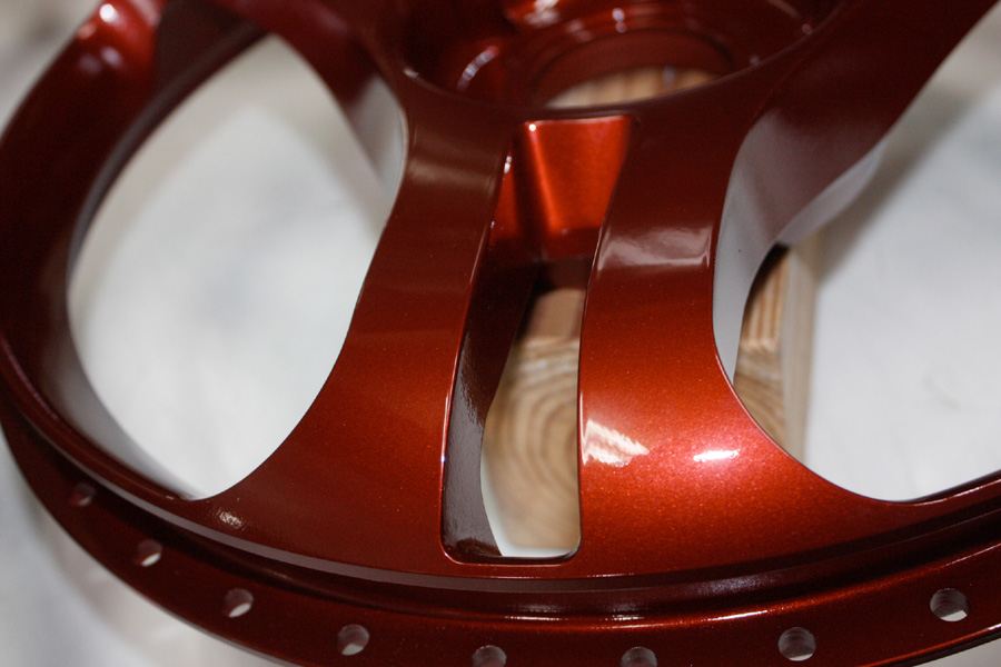 1Psホイールのこの方法の場合は焼付け温度の高いパウダーを先に塗って仕上げてからマスキングして溶剤ウレタンで被せる方法で、1Psホイールも塗り分け可能です。