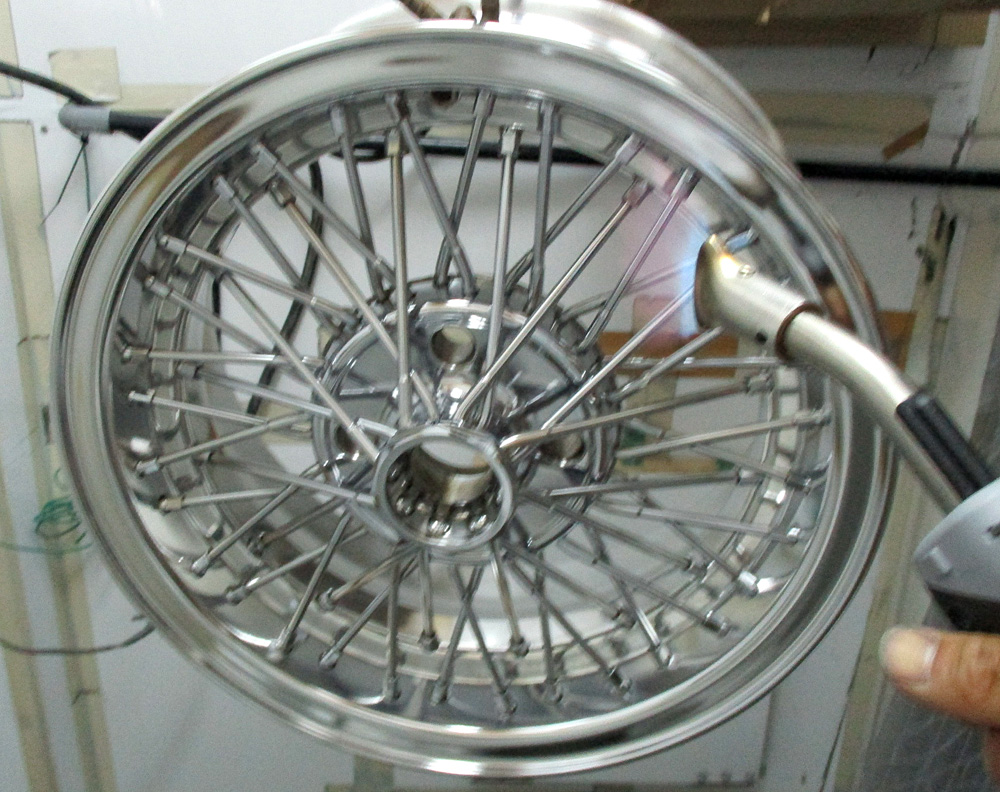 メッキのワイヤーホイールも再メッキ出来れば理想的ですが再メッキとなればリムとワイヤーを分解して組み付けなど現実的に不可能ですのでそんな分解出来ない構造のホイールを錆び取りからフル磨きが出来るのが当社独自の画期的な研磨工法のバレル研摩です。
