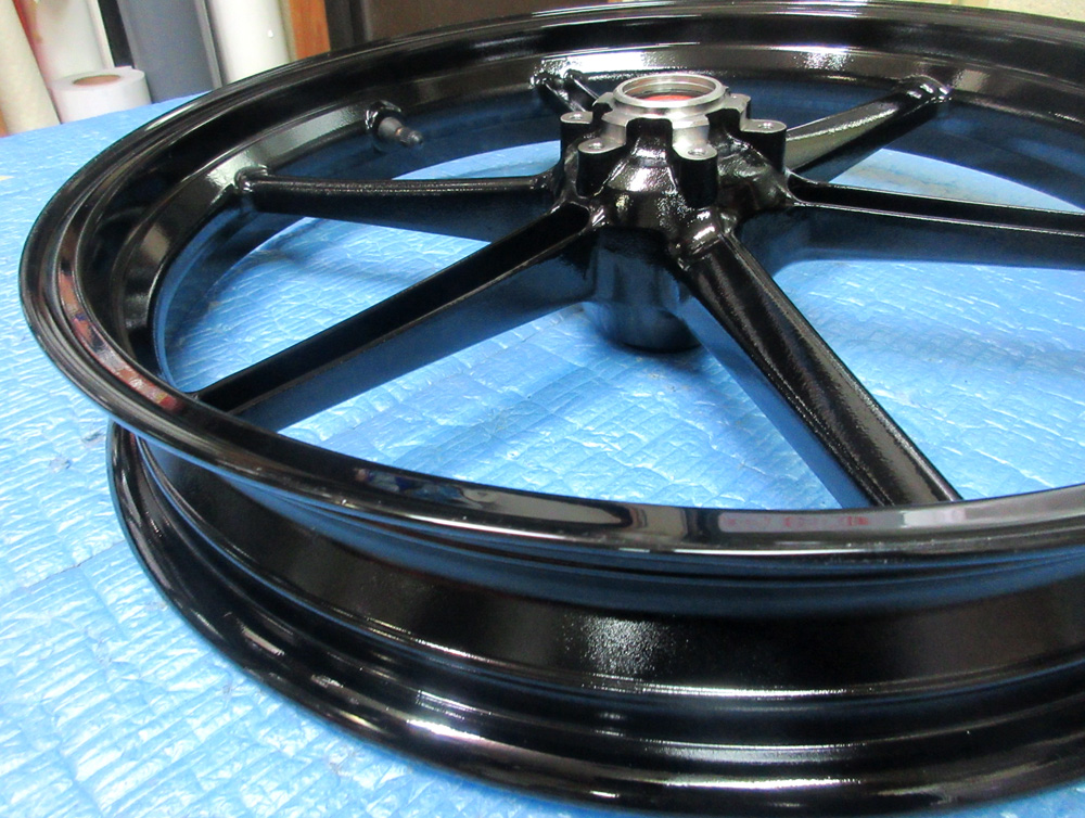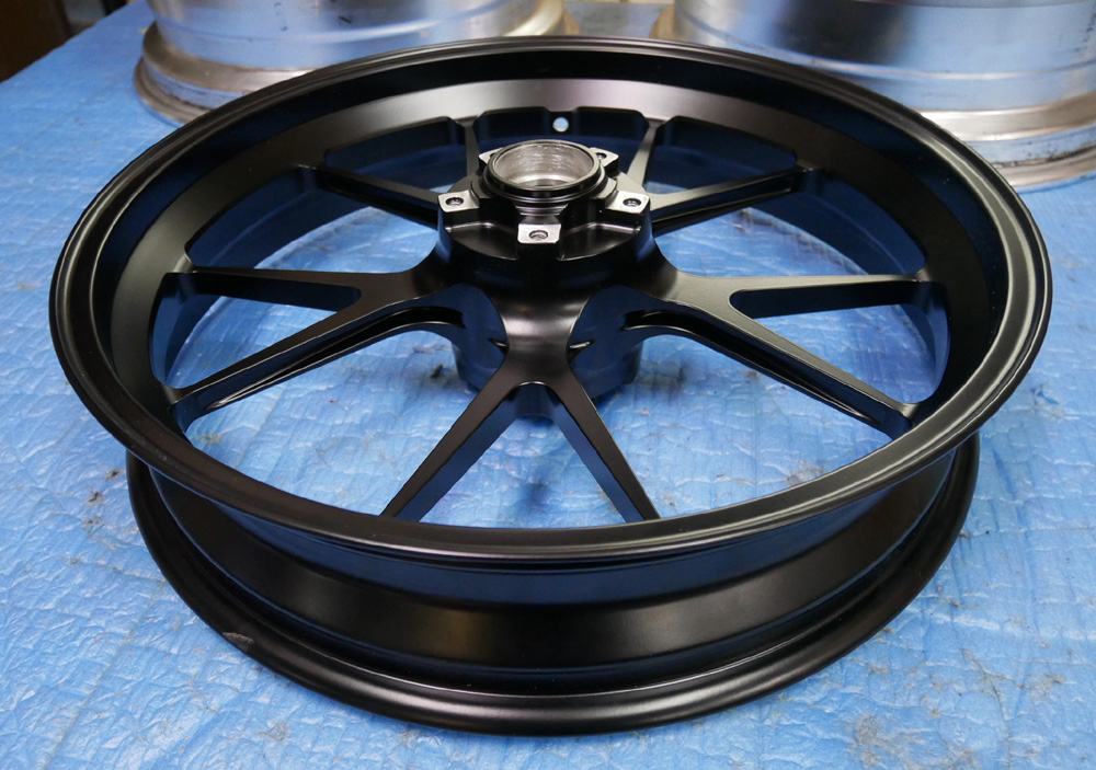 二輪アルミホイール(鋳造&鍛造)大きな曲り修理溶剤塗装&パウダーコート