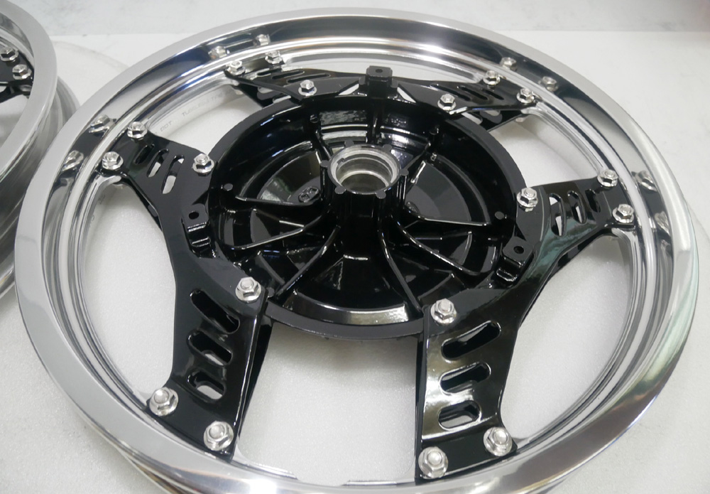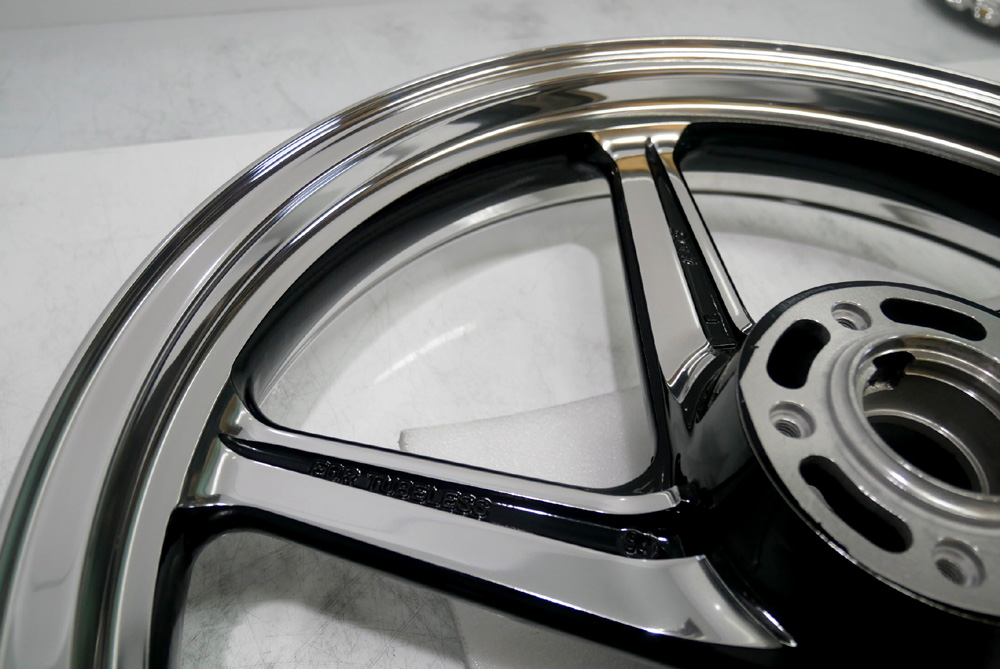 二輪ホイールの「溶剤カラー、パウダーカラー、パウダークリアー」など塗装は1本分の料金ですが、磨きに関しては二輪ホイールは表裏が無く両面磨きのため1本で2面磨き、2本で四輪の4本分と同じ工程料金になります。