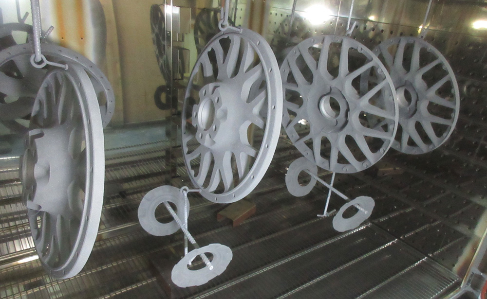 二輪ホイール&パーツ専用治具による当社独自のバレル研磨フルポリッシュ研磨工法!