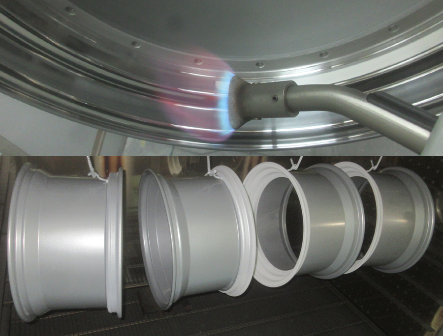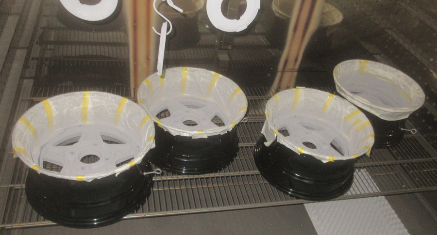 ホイール再塗装は「密着性・褪色耐UV性・耐熱性・頑丈肌」など総合的な耐久性UPから一品物ワンオフ塗装ならではのパウダーコートフィニッシュが理想的な塗装ですので4本セット再塗装は特殊カラーでない限り溶剤塗装の出番はぼ有りません。