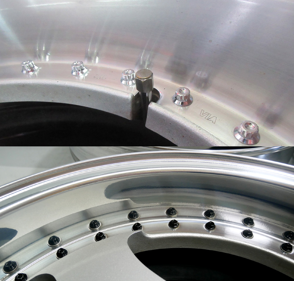 ADVAN17インチ3Ps溶接ハメ殺し削り込み有りリム修理BBFバフポリッシュ鏡面仕上げ溶剤アクリルクリアー