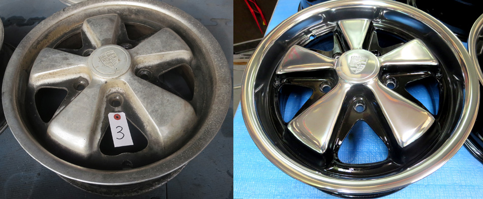 カラー塗装ホイールは塗装の密着性向上のためツブ肌ユズ肌状の鋳物肌を荒研磨してありサフ下塗装で平滑面を出しカラー塗装してあります。塗装剥離後、それらの鋳物肌のゆず肌ブツ肌を平滑面ツル肌になるまで様々なエアーツールや手ガケにより削り落としてさらにハンドバフをかけ最終工程のミラー研磨機にかけるまでの完全手作業研磨を下処理研磨といいます。