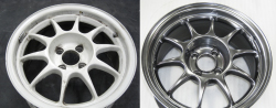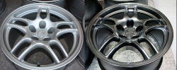 ハイパー塗装はドイツのブランドメーカーより始まり特殊な銀膜添付のレイヤー式(透かし)塗装です。ベースにパウダーコートを敷いてチタン(銀膜)をレイヤー式でベースコートに反映させるため、メタル調で強い光沢を放ち高級感あふれる表現となります。国産、外車の純正ホイールやブランドホイールなどで多く採用されています。