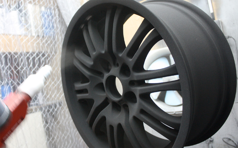 ハイパー塗装の最初の層となるアルミ素地の上にベースとなるパウダーコートの黒を載せます。