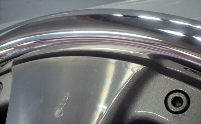 下記写真のように研磨筋の入った半端なリム研磨の手直し依頼や、曲り修正に伴うリム研磨手直しなど、頻繁にお受けしいる修正品です。既存のディスクでは根元奥まで研磨が出来ない構造のものやディスクに傷が入る恐れの有る物はなど当社では、全て分解して、他のディスクを組みリム根元奥から研磨していますのでより確実に綺麗に仕上がります。